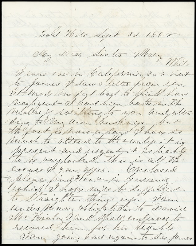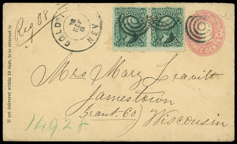 Gold Hill, Nevada "Reg 38", manuscript registry marking on 3¢ pink (U59) buff entire bearing 10¢ green (68) pair tied by four-ring cancels, matching "Gold Hill, Nev. Sep 8" cds to Jamestown, Wisc., 1868 letter; part of flap missing, Very Fine Western registered use.