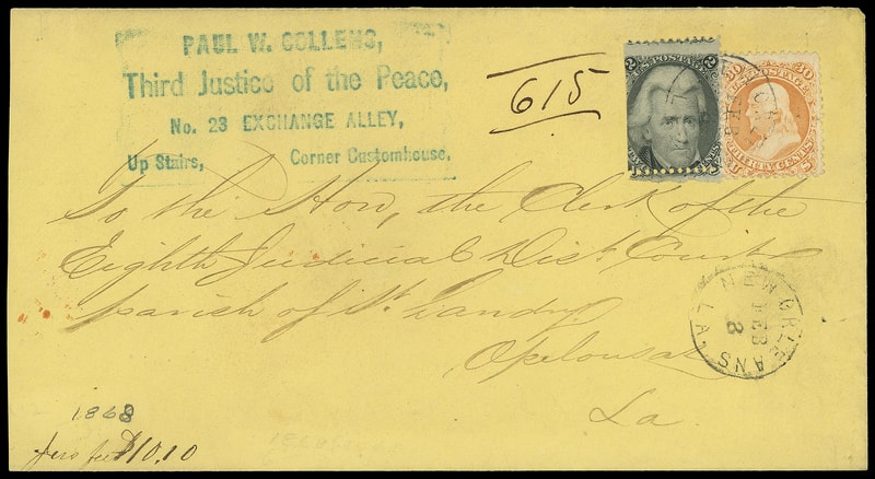 New Orleans La., 1868 legal-size yellow courthouse cover bearing 2¢ black (73) s.e. and 30¢ orange (71) , tied by partial "New Orleans La. Feb 8" cds, matching strike adjacent with "615" registry number to Opelousa La., ms. " $10.10 " notation at bottom left; reduced at left, Very Fine quadruple-rate use plus 20¢ registry fee.