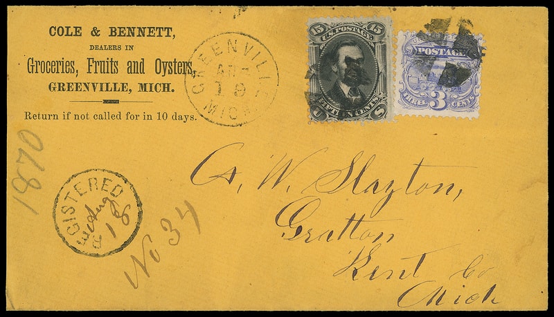Greenville Mich. "Registered", circular handstamp with ms. "No. 34" number adjacent, matching "Greenville Mich. Aug 19" cds duplexed with quartered corks that tie combination franking of 15¢ black, F grill (98) and 3¢ ultramarine (114) on orange Cole & Bennett Groceries, Fruits & Oysters corner card cover to Gatton Mich., pencil 1870 dating, Very Fine and choice mixed issue franking, ex-Landau ; with 2007 P.F. certificate.