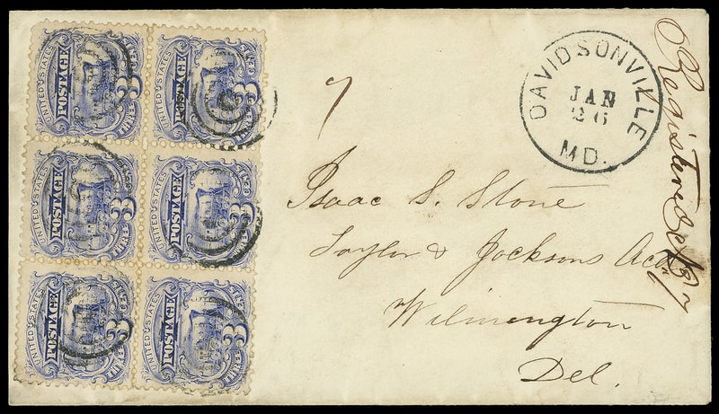 Davidsonville Md. "Registered No. 7", manuscript marking on 1870 registered cover bearing 3¢ ultramarine (114) block of six tied by four-ring targets, matching sharp "Davidsonville Md. Jan 26" cds to Wilmington Del.; reduced slightly at left, top left stamp surface scrape, a Very Fine registered use prepaying the 3¢ letter rate plus 15¢ registry fee, ex-John R. Hill Jr. ; with 2001 P.F. certificate.