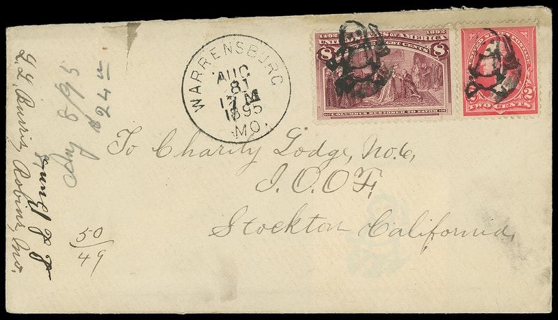Warrensburg Mo Aug 8, 1895, cds duplexed with " Child Holding Sword " fancy cancels tie 8¢ Columbian (236) and 2¢ rose pink (279Bc) on cover to Stockton Cal., docketed as "$24.00" enclosed at left; some extra ms., Very Fine and scarce early pictorial registry fancy cancels.