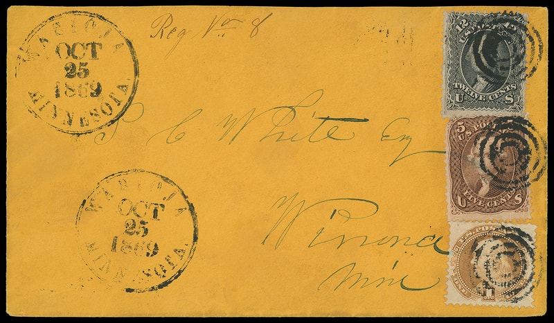Wasioja, Minn., orange cover bearing combination franking of 1868, 5¢ brown, F. grill (95) , rounded corner, 12¢ black, F. grill (97) and 1869, 1¢ buff (112) , each canceled by bold four-ring cancel, matching two strikes of "Wasioja, Minnesota, Oct 25, 1869" cds and ms. "Reg. No. 8" at top to Winona Minn., Very Fine and rare 1868-1869 registered combination.