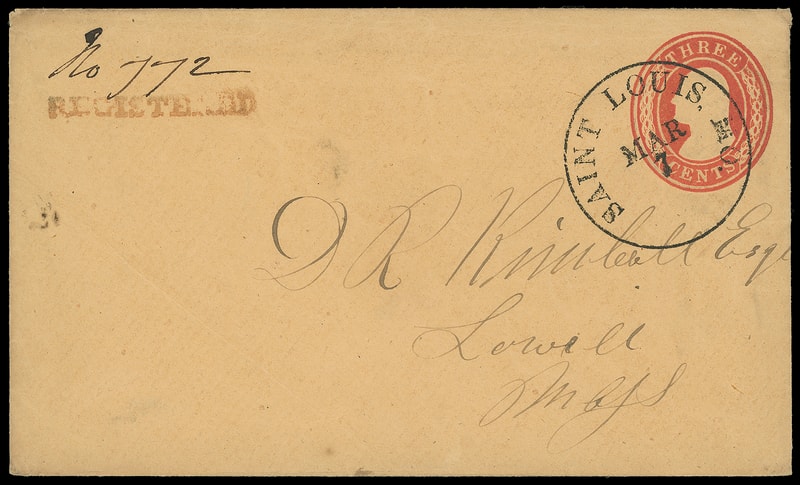 St. Louis, Mo. "Registered", red straightline with ms. "No 772" number on 3¢ red (U10) buff Nesbitt entire canceled by sharp "Saint Louis, Mo. Mar 7" cds to Lowell Mass., Very Fine.