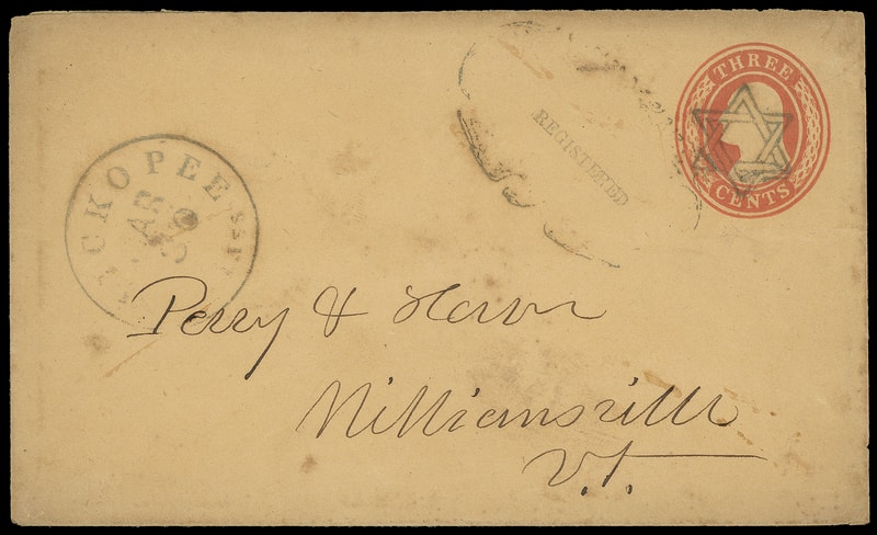 Chicopee, Mass. "Registered", straight line in ornamental eagle frame, on 3¢ red (U10) buff entire canceled by Star of David fancy cancel , matching "Chickopee, Mass. Mar 30" cds to Williamsville Vt., Very Fine, the only recorded example , ex-Landau .
