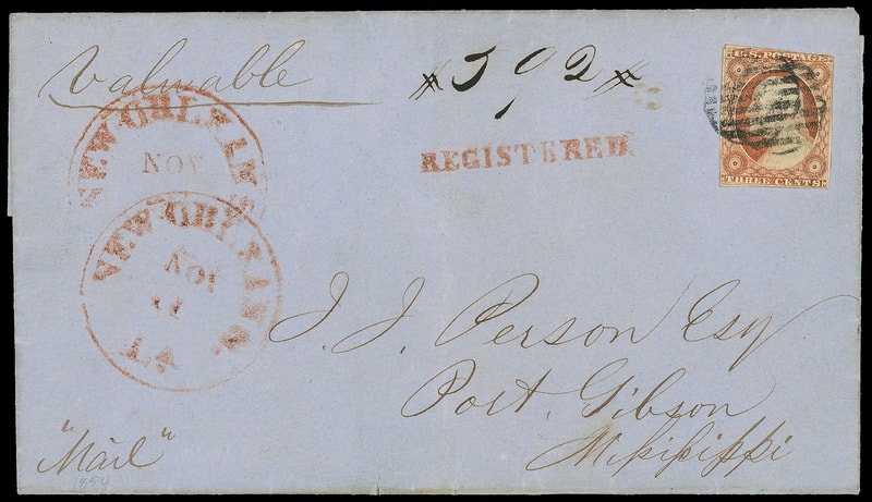 New Orleans La. "Registered", choice red straightline and ms. "502" number, matching two strikes of red "New Orleans La. Nov 11" cds on 1853 blue folded letter to Port Gibson Miss., endorsed " Valuable " at top left, Very Fine.