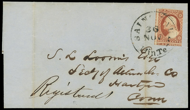 Saint Paul, Min. Ter. "Registered", manuscript postmark on blue folded 1852 letter bearing 3¢ dull red (11A) , huge margins to in, tied by "Saint Paul, Min. Ter. 26 Nov" cds to Hartford Conn.; file folds, Very Fine, the only recorded unofficial registered territorial cover .
