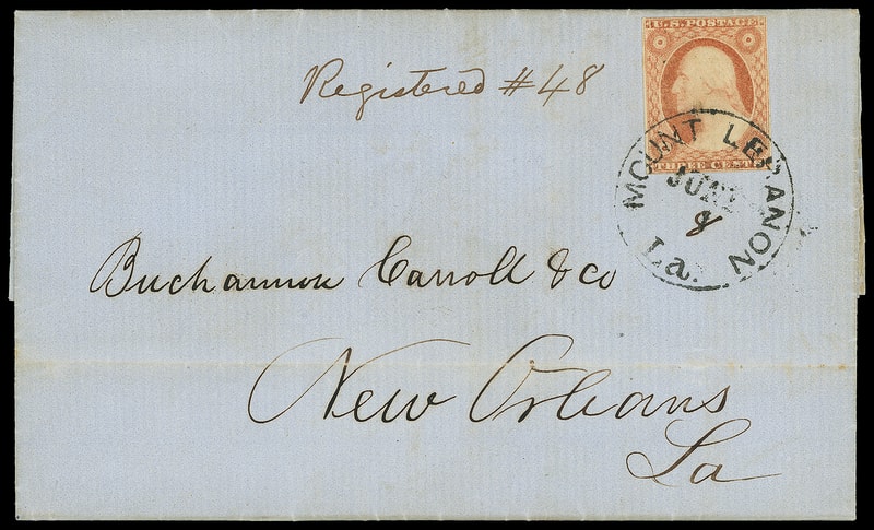 Mount Lebanon La. "Registered #48", manuscript postmark on 1855 blue folded letter bearing 3¢ dull red (11A) margins except in at top, tied by sharp "Mount Lebanon La. June 8" cds from Buchannon Carroll & Co. correspondence to New Orleans La., Very Fine.