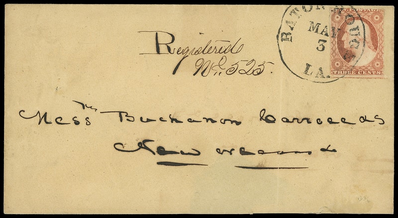 Baton Rouge La. "Registered, No. 525", neat ms. script postmark on cover bearing 3¢ dull red (11A), large margins to in, tied by neat "Baton Rouge La. May 3" cds from the Carroll Hoy correspondence to New Orleans La.; partial bottom flap, Very Fine.