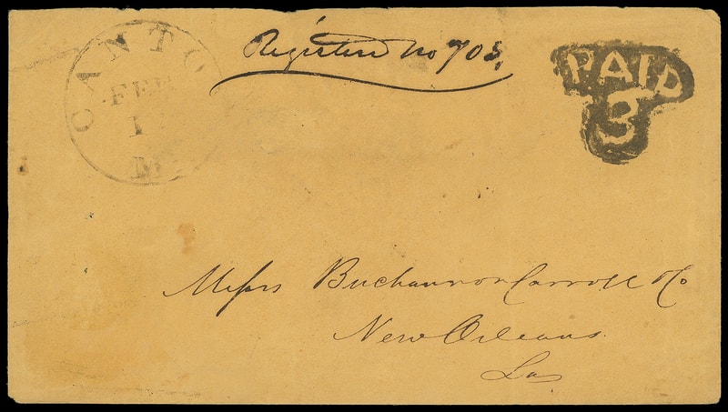 Canton Miss. "Registered No. 705.", manuscript marking with light "Canton Ms. Feb 1" cds and bold negative "Paid 3" rating on buff cover from the Buchannon Carroll & Co. to New Orleans La.; some small flaws, Very Fine and rare fancy registered use.