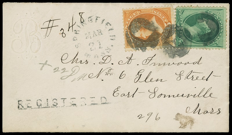 Springfield Mass. "Registered", straightline with ms. "348" number, matching "Springfield Mass. Mar 21" rimless cds duplexed with negative diamond fancy cancels tie 3¢ green (147) and 15¢ deep orange (152) on lady's cover to East Somerville Mass., Very Fine.