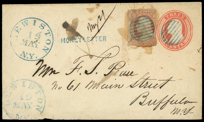 Lewiston N.Y. "Money Letter", blue 31.5mm straightline used with matching two strikes of "Lewiston N.Y. 19 May" cds and circular 7-bar grid cancels 3¢ yellowish rose red (11A) on 3¢ red on white entire (U9) to Buffalo N.Y., ms. "My 21" docketing, probably 1856 usage; no bottom flap, gum stains around stamp and ink smear, Fine and rare, the only recorded example , ex-Piller .