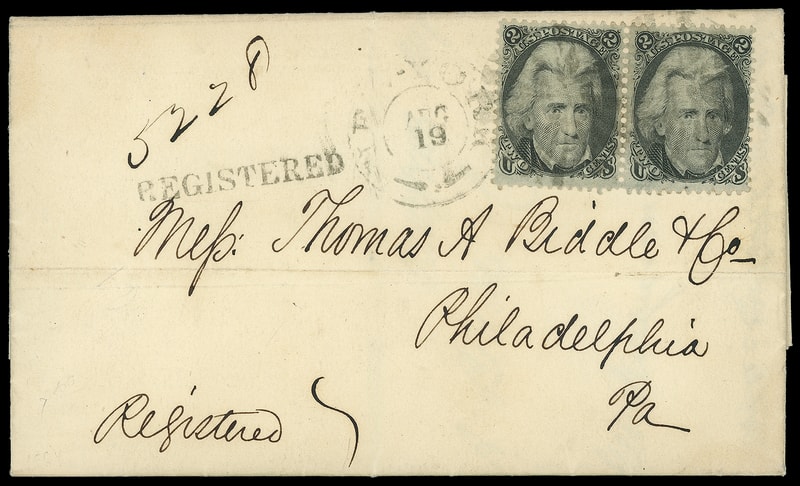 New York N.Y. "Registered", black 35mm straightline with ms. "5228" registry number, matching "New-York, Aug 19" flueron cds and radial cancels tie 2¢ black (73) pair on 1864 folded letter to Philadelphia Pa.; right 2¢ tear, Very Fine and unique 2¢ black registered use.