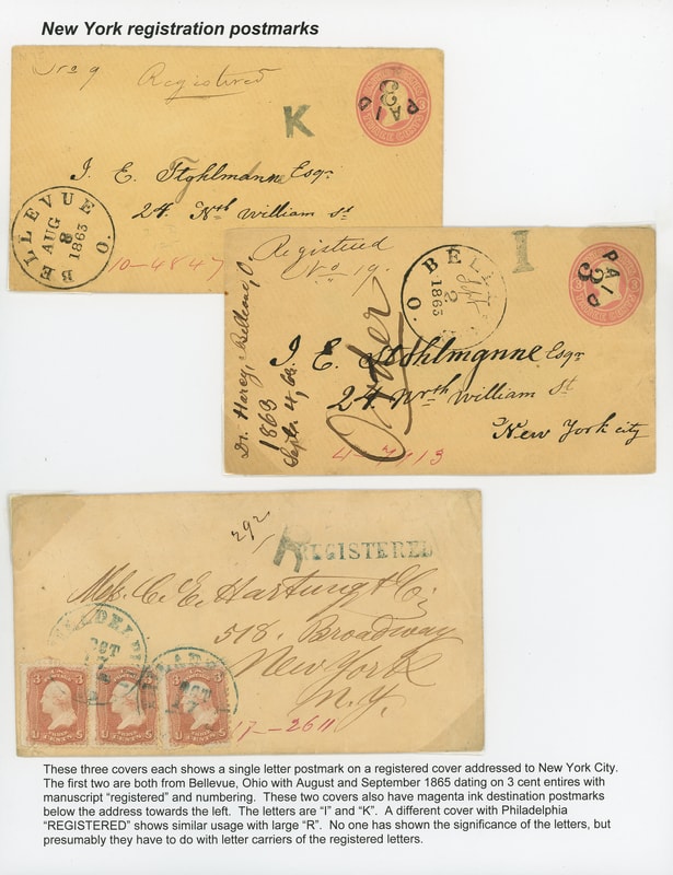New York N.Y. - Letter Markings, group of three inbound covers mounted on exhibit page, each shows different letter comprising "Bellevue, O. Aug 8, 1863" cds with "Paid 3" cancel on 3¢ pink (U35) buff entire with New York " K "; "Bellevue, O. Sept 2, 1863" cds with "Paid 3" cancel on 3¢ pink (U35) buff entire with New York " I ", docketed "Order" across face; and blue "Philadelphia Pa. Oct 17" cds ties 3¢ rose (65) pair and single, latter faulty, with matching "Registered" straightline and New York " R ", Very Fine group.