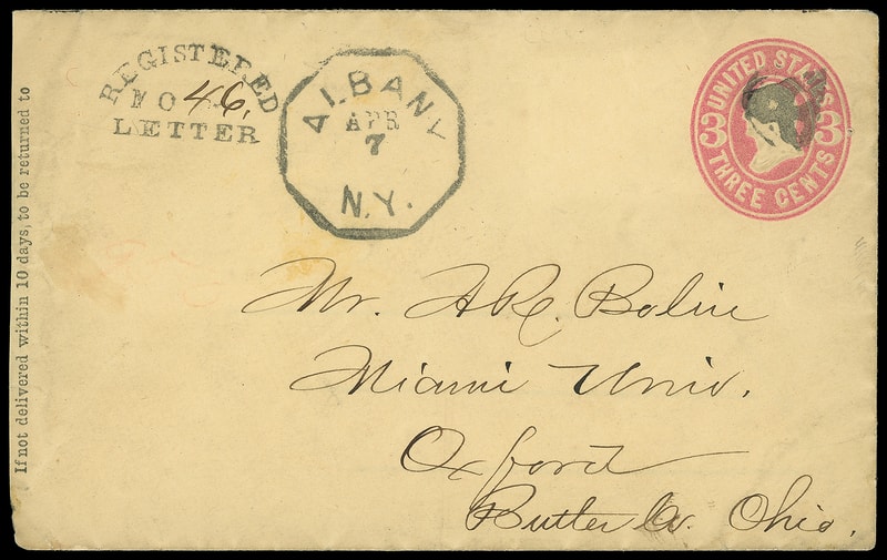 Albany N.Y. "Registered Letter No.", black arc handstamp with ms. "46" registry number, on 3¢ pink (U59) entire canceled by fancy heart , matching "Albany N.Y. Apr 7" octagon postmark to Oxford Oh.; reduced at left, F.-V.F., a unique style of handstamp.