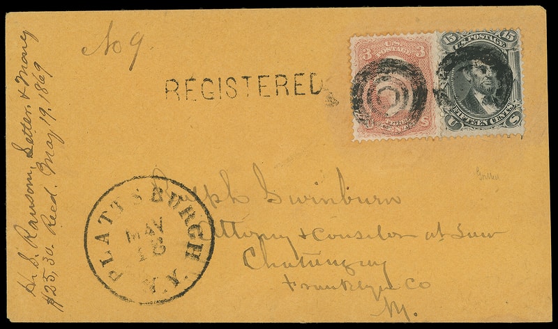 Plattsburgh N.Y. "Registered", straightline with ms. " No 9 " registry number, matching "Plattsburgh N.Y. May 18" cds and target cancels tie 3¢ rose red, F. grill (94) and 15¢ black, F grill (98) on orange cover to Chateaugay N.Y., 1869 docketing at left, Very Fine.