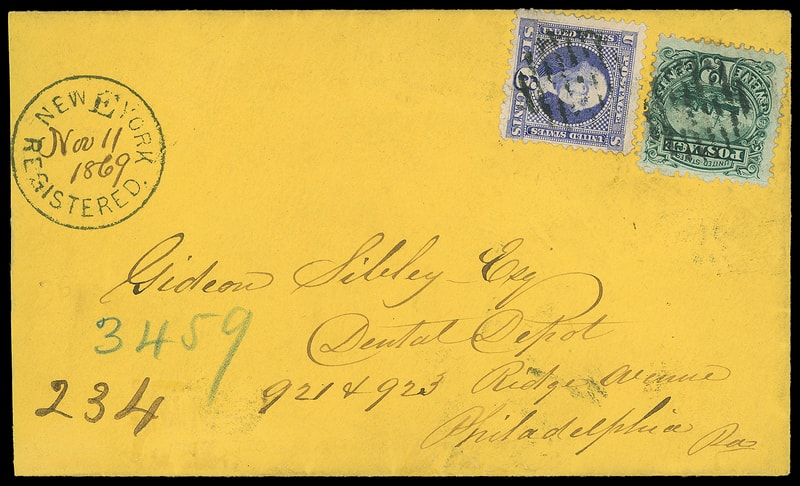 New York 'E' Registered "Nov 11, 1869", cds with ms. dating on 1869 yellow cover bearing 6¢ ultramarine (115) and 12¢ green (117) , open circular grid cancels, addressed to Dental Depot, Philadelphia Pa.; reduced at left, Very Fine and scarce 1869 Issue New York Station E registered use.