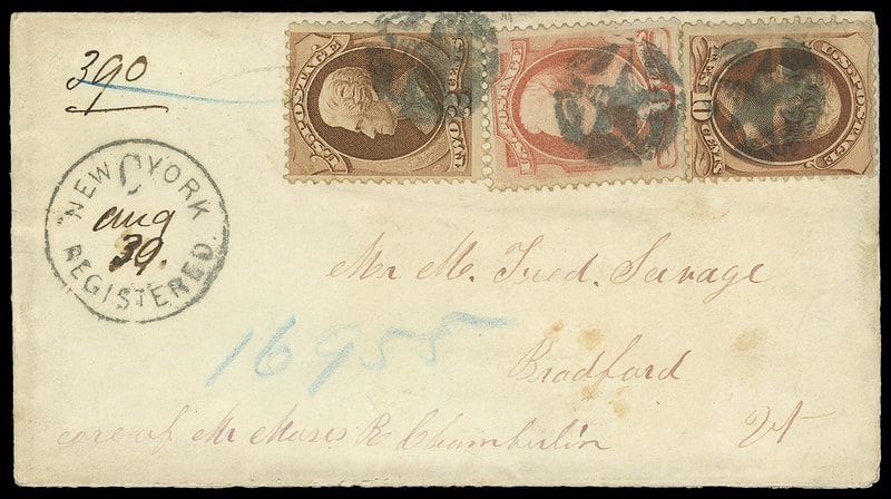 New York 'C' Registered, "Aug 30", station cds with ms. date and matching ms. "390" registry number crossed out in blue crayon with "16955" number added, matching star fancy cancels tie 2¢ red brown (146) , 6¢ dull pink (159) and 10¢ brown (150) on cover to Bradford Vt.; flap with registry receipt remnant, Very Fine and rare NYC station registry use.