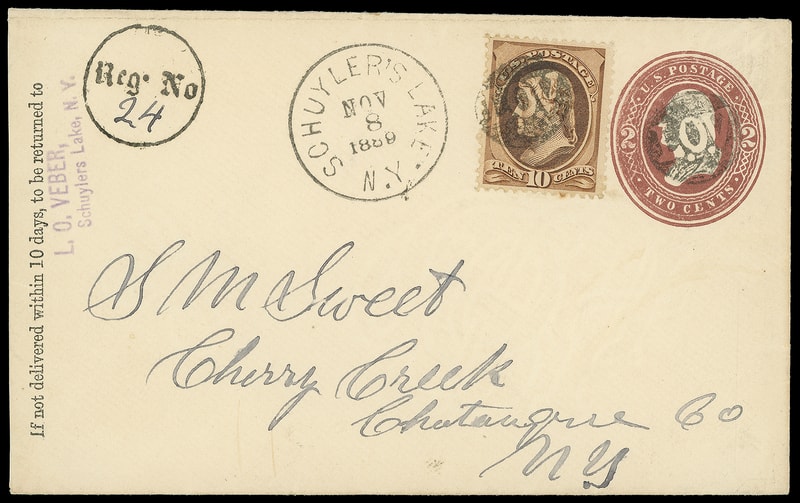 Schuyler's Lake N.Y., Nov 8, 1889, cds and bold "Reg. No 24" circular handstamp on 2¢ red brown entire bearing 10¢ brown (209) tied by negative " L.O.V. " oval fancy cancel to Cherry Creek N.Y.; reduced at left, Very Fine.