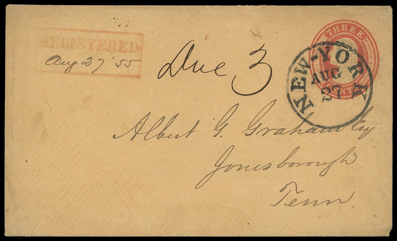 New York N.Y. "Registered", framed handstamp with ms. " Aug 27 '55 " dating on 3¢ red (U10) buff Nesbitt entire canceled with bold "New-York, Aug 27" cds to Jonesborough Tenn., ms. " Due 3 " rating, Very Fine, only 2-3 examples recorded .