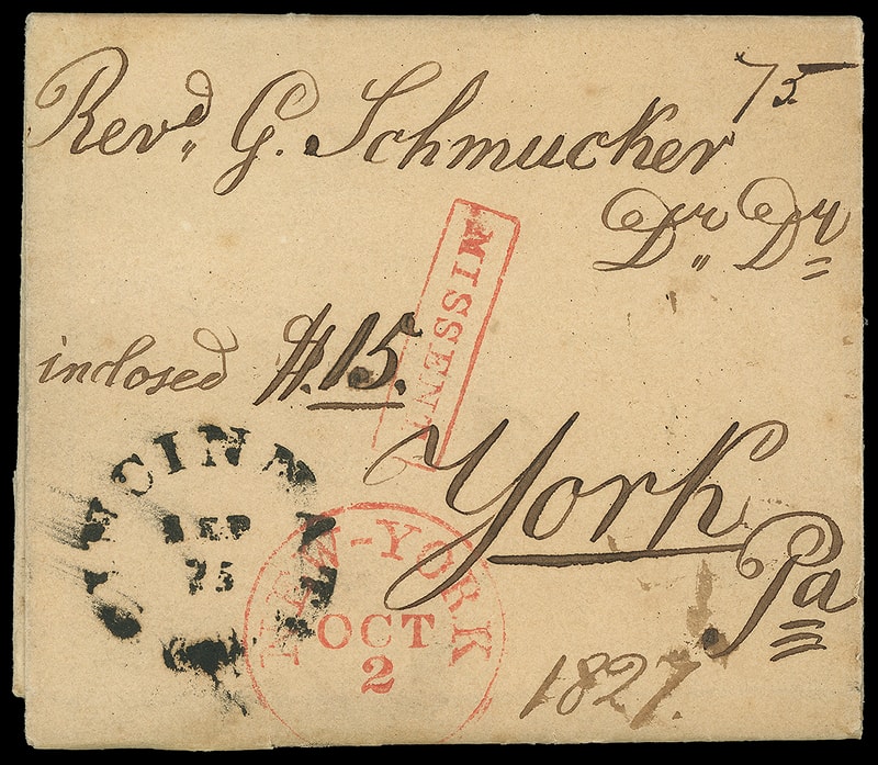 Cincinnati O. Sep 25, rimless cds with ms. "75" cent triple-weight rating to York Pa., endorsed " inclosed $15. ", red "New-York, Oct 2" cds and matching "Missent" framed handstamp, Very Fine and extremely early money letter.