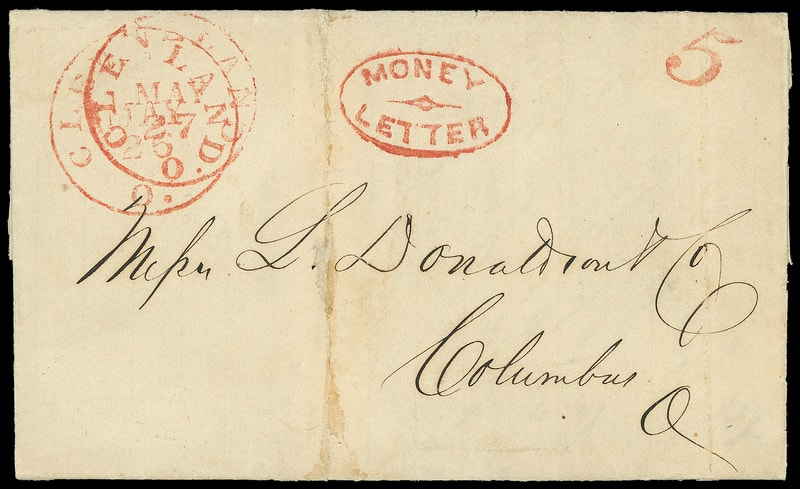 Cleveland, Ohio "Money Letter", choice red oval handstamp with matching double strike of "Cleveland O. May 27" cds and "5" rating handstamp on 1851 folded letter to Columbus, Ohio; some reinforcing with light vertical fold stain and small tear, a Very Fine strike, ex-Landau .
