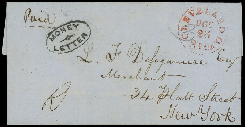 Cleveland, Ohio "Money Letter", bold black oval handstamp on 1852 blue folded letter with red "Cleveland. O. '3 Paid' Dec 28" integral-rate cds to New York City, additional ms. " R " registry marking at bottom left; some light wrinkles, Very Fine.