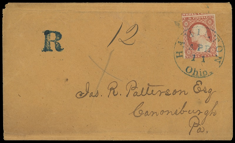 Hamilton, Ohio "R", bold blue strike with ms. "12" registry number, matching "Hamilton, Ohio. Apr 11" cds ties 3¢ dull red (11A) , huge margins to in, on orange cover to Canonsburgh Pa., additional pencil "X"; some edge wear, Very Fine.