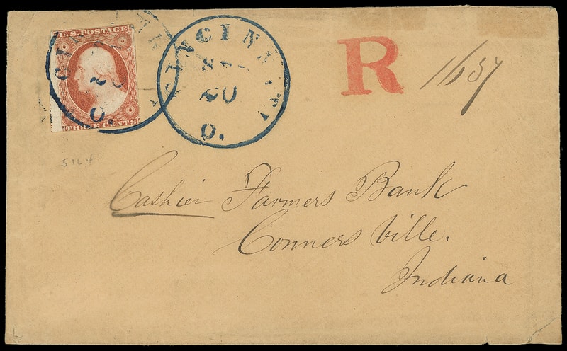 Cincinnati O. "R", perfect red handstamp with ms. "1657" registry number on buff cover bearing 3¢ dull red (11) left sheet margin single , pos. 51L4, tied by blue "Cincinnati O. Sep 20" cds, second strike adjacent to Connersville Ind., original 1855 letter indicating $106.98 note enclosed; some wear and small corner tears, Very Fine and striking early registered use.