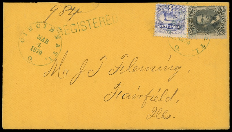 Cincinnati O. "Registered", blue straightline with ms. "784" number, matching "Cincinnati O. Mar 4, 1870" cds adjacent and second strike tying 1868, 15¢ black, F grill (98) and 1869, 3¢ ultramarine (114) to Fairfield Ill.; small top edge mend and flap missing, otherwise fresh and Very Fine, only recorded example .
