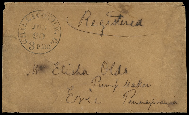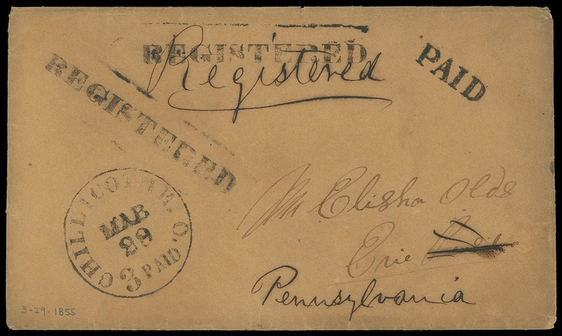 Columbus, Ohio "Registered", two 4½ x 56mm transit straightline strikes on buff cover with "Chillicothe, O. '3 Paid' Mar 29" integral-rate cds and matching "Paid" handstamp with ms. " Registered " to Erie Pa.; accompanied by second use without straightline, circa 1855 "Chillicothe, O. '3 Paid' Jun 30" integral-rate cds with ms. " Registered " from same correspondence to Erie Pa., which is the last day of the unofficial registration period; some edge wear, light aging, F.-V.F. and interesting registered exhibit pair.