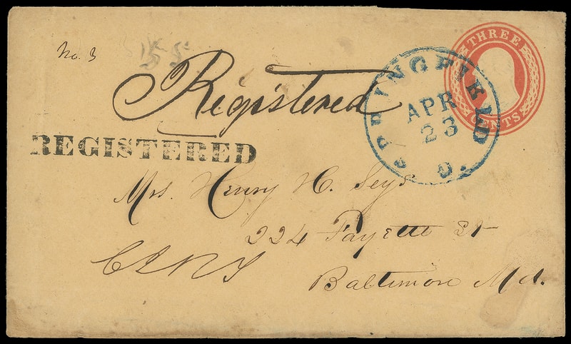 Columbus, Ohio "Registered", 4½ x 56mm transit straightline on 3¢ red (U10) buff entire canceled by blue "Springfield O. Apr 23" cds with ms. " Registered " rating to Baltimore Md., small ms. "No 3" correspondence number, pencil 1855 dating; accompanied by second use without straightline, blue "Springfield O. Jun 13" cds with matching "Paid" and "Paid 3" in circle ratings with ms. " Registered " to Williamstown Mass., small ms. "No 40" correspondence number, pencil 1855 dating, F.-V.F. pair.