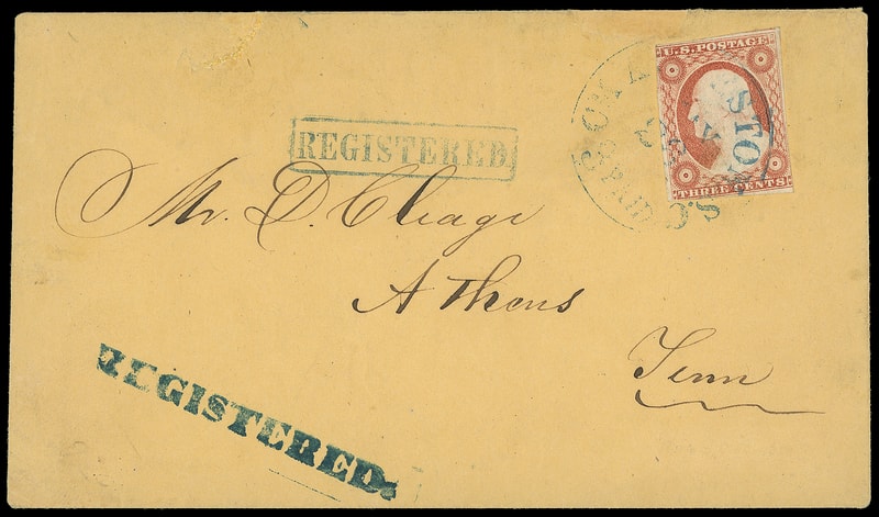 Athens, Tenn. "Registered.", bold blue straightline as receiver on buff cover bearing 3¢ dull red (11A) tied partial "Charleston S.C. '3 Paid' May 26" integral-rate cds, matching "Registered" framed handstamp (Milgram R-CHA-1) to Athens Tenn.; repaired top edge tears, partial flap, Very Fine appearance, the only recorded classic cover with two different "registered" handstamps .