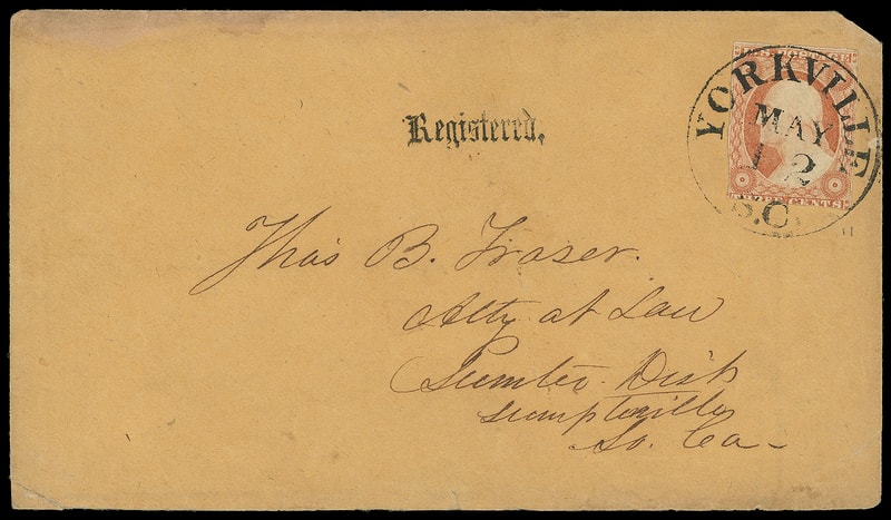 Yorkville S.C. "Registered", Old-English type straightline, matching "Yorkville S.C., May 12" cds ties 3¢ dull red (11A) , margins to in, to Summerville S.C.; light top left edge stain, upper right corner clipped, otherwise Very Fine.