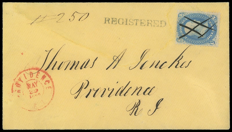 Providence R.I. "Registered", straightline with ms. "250" registry number, red "Providence R.I. May 25, 1863" cds on yellow drop cover bearing pen canceled 1¢ blue (63) to local address; large repaired tearscover repaired and cleaned, attractive and Very Fine appearance, the earliest recorded registered drop cover , ex-Flack .