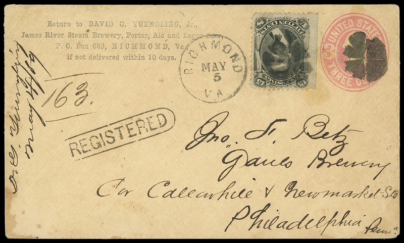 Richmond Va. "Registered", oval handstamp with ms. "163" number, matching "Richmond, Va. May 5" cds duplexed with cork cancels tying 15¢ black, F grill (98) , short perf, on 3¢ pink (U59) entire to Philadelphia Pa., 1869 docketing at left; light bottom left edge stain, F.-V.F.