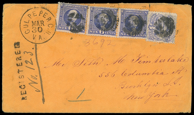 Culpeper C.H., Va. "Registered", straightline and blue ms. "No. 123." registry number, on 1870 registered orange cover bearing 3¢ ultramarine (114) and 6¢ ultramarine (115) single and pair, couple stamp flaws, tied by small cork cancels duplexed with bold "Culpeper C.H. Va. Mar 30" cds to Brooklyn N.Y.; couple small stamp flaws, cover reduced at right, flap tears, F.-V.F. and unique 1869 issue registered franking.