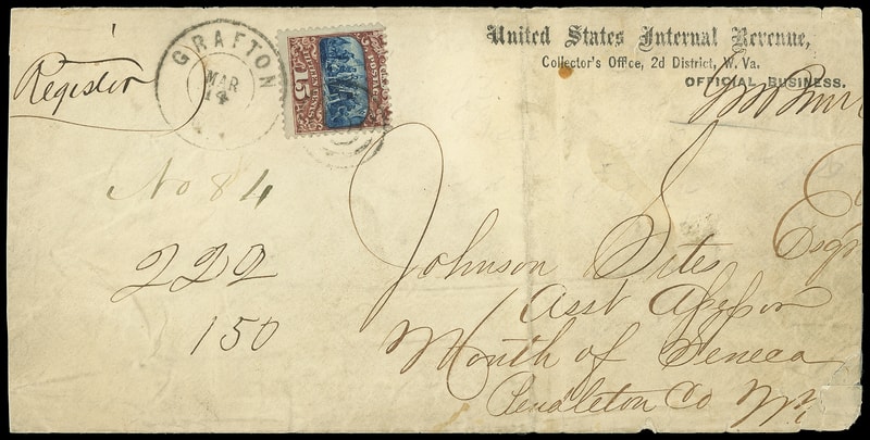 Grafton W.V. "No. 84", ms. registry number and endorsed "Register" by sender on 1869 legal-size United States Internal Revenue imprint cover bearing 15¢ brown & blue, ty. II (119) , centered to top, rich color, tied by "Grafton W. Va. Mar 14" double-circle datestamp to "Mouth of Seneca", Pendleton Co. N.Y., free franked by Internal Revenue agent at top right; reduced at sides, cover quite worn, Fine and unusual registered use, the free frank paid domestic postage but the 15¢ stamp was necessary to pay the registry fee, ex-Robertson .