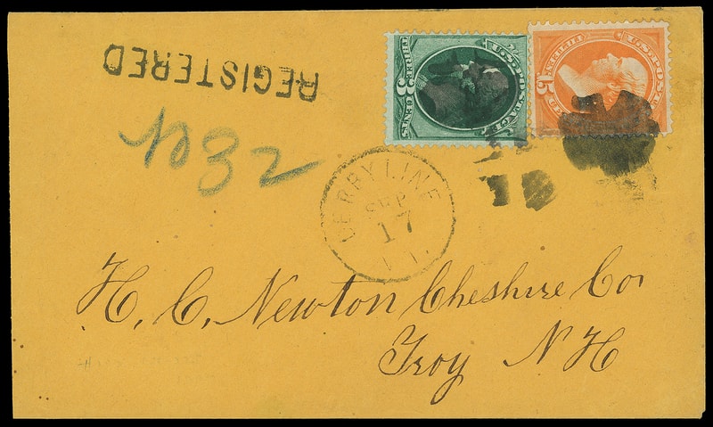 Derbyline Vt. Sep 17, cds with "Registered" straightline and blue crayon "No 32" registry number on circa 1874 orange cover bearing 3¢ green (158) and 15¢ yellow orange (163) , rich colors, canceled by cork cancels and cross-roads duplexed with Derbyline cds to Troy N.H.; reduced slightly at left, Very Fine.