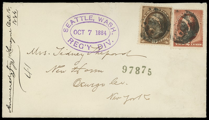 Seattle, Wash. Reg'y Div. Oct 7, 1884, violet double-oval registry postmark on cover bearing 2¢ red brown (210) and 10¢ brown (209) , each tied by partial mask fancy cancels to Oswego County, N.Y.; small edge tear, fresh and Very Fine.