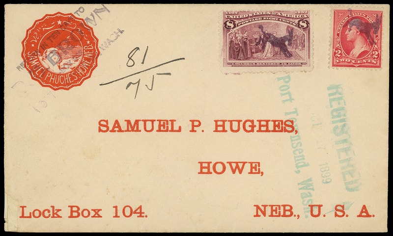 Registered, Oct 17 1889, Port Townsend, Wash., blue-green three-line registry postmark, ms. "81/75" registry numbers on red preprinted Samuel P. Hughes envelope to Howe, Nebraska with "D.E. Brown" handstamped return address bearing 8¢ Columbian (236) and 2¢ carmine (279B) canceled by bold Kicking Mule (AN-11) fancy cancels ; reduced slightly at left with small lower corner mend, otherwise Very Fine and attractive registered kicking mule use, ex-Gibson .