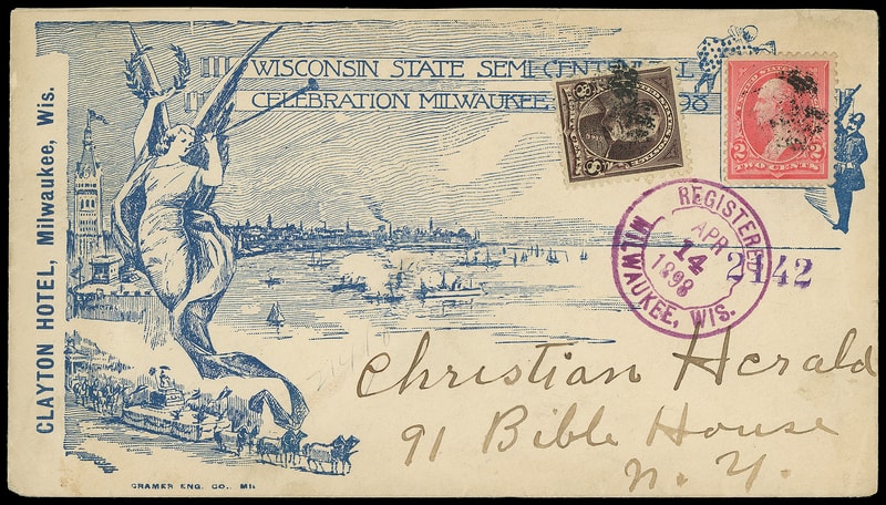 Milwaukee, Wisc. Registered, Apr 14, 1898, bold purple cds on overall blue illustrated Wisconsin State Semi-Centennial Celebration cover bearing 2¢ pink (267) and 8¢ violet brown (272) canceled by cork cancel to New York City, purple New York (4.16) framed arrival backstamp, Very Fine.