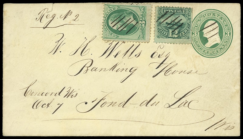 Concord, Wisc. "Reg. No. 2", manuscript registry marking with matching "Concord Wis. Oct 7" postmark and pen strokes tie 3¢ green (147) and 12¢ green (117) s.e. on 3¢ green entire to Fond du Lac Wisc.; small edge tear, no flap, Very Fine and attractive mixed issue registered use; with 1982 P.F. certificate.