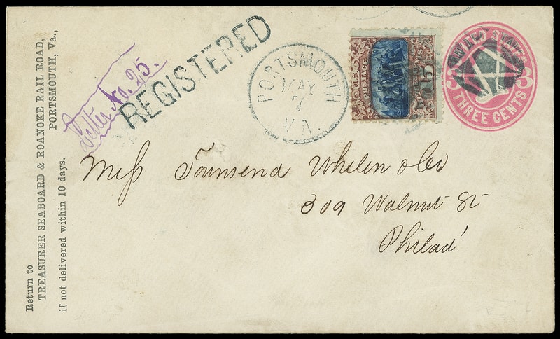 Portsmouth Va. "Registered", neat straightline with purple ms. " Letter No. 25. ", matching "Portsmouth Va. May 7" cds duplexed with incised star cancel ties 15¢ brown & blue (119) on 3¢ pink (U58) entire to Philadelphia Pa., flap with remnant of registry return receipt; closed spindle hole, otherwise Very Fine and scarce registered fancy cancel use.