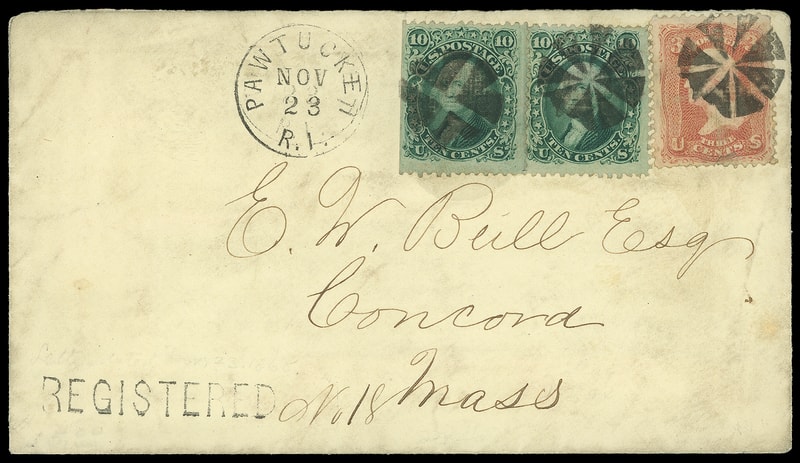 Pawtucket R.I. "Registered", straightline with ms. "No. 18", on amber cover bearing 3¢ rose (88) and two 10¢ green (89) s.e. singles, crossroads duplexed with "Pawtucket R.I. Nov 23" cds ties left 10¢, other stamps tied by matching circle of wedges cancels to Concord Mass.; light soiling, no flap, 3¢ small tear, F.-V.F. Scott No. 89 $700 as used singles.