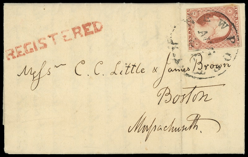 Newport, R.I. "Registered", red 4½ x 48½mm straightline on 1854 folded letter bearing 3¢ dull red (11A) , margins to slightly in, tied by "Newport R.I. Aug 24" cds to Boston Mass., letter from George Bancroft to publishers Little & Brown discussing his work "The History of the American Revolution to the Treaty of Peace" to be added to five already published volumes, Very Fine.