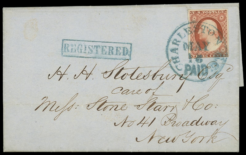 Charleston S.C. "Registered.", neat blue framed handstamp, matching bold blue "Charleston S.C. 'Paid' May 16" cds ties 3¢ dull red (11A) , three large margins, on 1852 blue folded letter to New York City; light horizontal fold, Very Fine and striking unofficial registered cover.