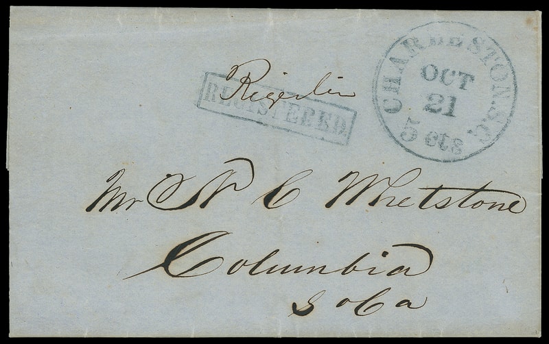 Charleston S.C. "Registered.", blue framed handstamp, matching blue "Charleston S.C. '5 cts' Oct 21" cds on 1853 blue folded letter to Columbia S.C., additional ms. "Registered", letter indicated $50 enclosed, fresh and Very Fine.