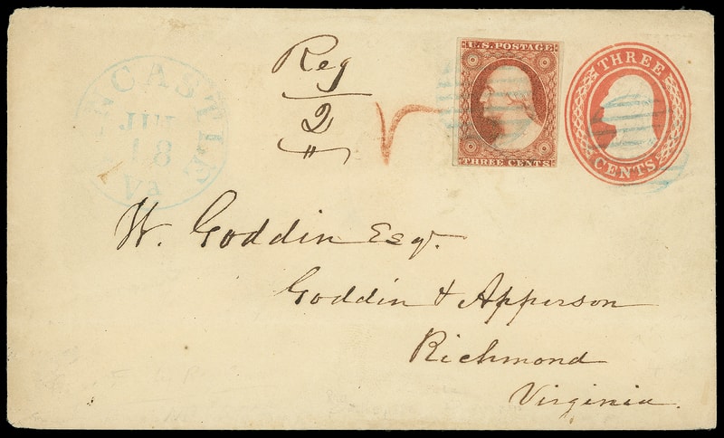 Lancaster Va. "Reg / 2", manuscript registry postmark on 3¢ red (U9) Nesbitt entire uprated with 3¢ dull red (11) , large margins to touched, tied by blue circular grid cancel, matching light "Lancaster Va. Jul 18" cds to Richmond Va. where red crayon registry check mark probably applied; flap torn, 3¢ preprint wrinkle, fresh and Very Fine.