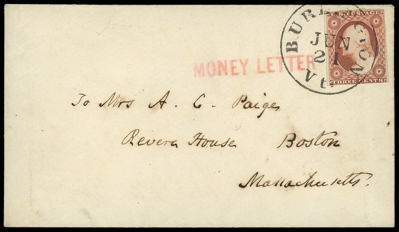 Burlington Vt. "Money Letter", red straightline on cover bearing 3¢ dull red (11A) large margins to in, tied by "Burlington Vt. Jun 21" cds to Boston Mass.; bit of flap missing, Very Fine and rare money letter use, only two recorded examples .