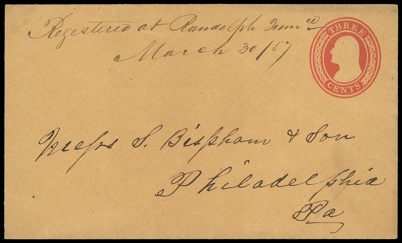 Randolph Tenn. "Registered", manuscript postmark "Registered at Randolph Tennee., March 30/57" on 3¢ red (U10) buff Nesbitt entire to Philadelphia Pa., Very Fine and early unofficial registry use.